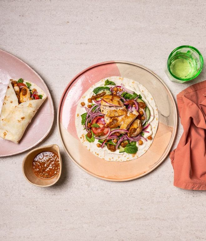 Chicken, Chickpeas, Cucumber, Free-range Chicken Breast, Free-range Chicken Breasts, Fresh Mint, Lemon Juice, Onion, Pesto Princess Chermoula Paste, Salad Leaves, Smoked Paprika, Sour Cream, Tomato, Tomatoes, Wheat Flour Tortillas