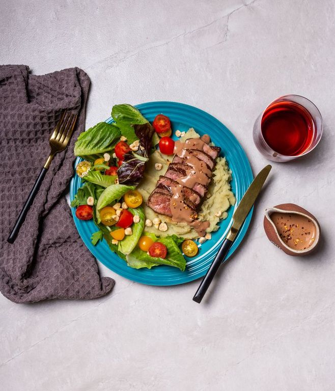 Plate up the Beef rump slices and pour over the chilli-choc sauce (to taste). Side with the salad and the sweet potato mash. Sprinkle over the toasted Hazelnuts.