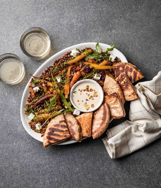 ALL TOGETHER NOW: In a salad bowl, combine the roasted carrots and lentils, the rinsed green leaves, the pomegranate gems, ½ the chopped mint, a generous drizzle of olive oil, and seasoning. Set aside. In a small bowl, loosen the tahini-mustard dressing with water in 5ml increments until a drizzling consistency. Add the lemon juice, a sweetener, and seasoning. GET THE ROAST GOING: Preheat the oven to 200°C. Spread the halved baby carrots and the drained lentils on a roasting tray. Coat in oil, the cumin, the grated garlic, and seasoning. Roast in the hot oven until golden, 25-30 minutes (shifting halfway). PISTACHIO MOMENT: Place the chopped pistachios in a pan over medium heat. Toast until golden brown, 2-3 minutes (shifting occasionally). Remove from the pan and set aside. THE TOAST OF THE TOWN: When the carrots and lentils have 5-7 minutes remaining, return the pan to medium heat. When hot, toast the pitas until heated through, 30-60 seconds per side. Alternatively, place them on a plate and heat up in the microwave, 30-60 seconds. When cool enough to handle, cut into quarters. SALAD SPECIAL: Dish up the roasted carrot salad. Top with the crumbled feta and sprinkle over the toasted pistachios. Drizzle over the tahini-mustard dressing and garnish with the remaining mint. Side with the pita quarters. Well done, Chef!