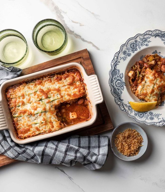 The ultimate veggie bake has just landed, Chef! A classic, golden-baked gratin is loaded with leeks, tomato passata, a chilli mix, baby marrow, borlotti beans, and Danish-style feta. Finished off with a zesty pea crumb and sided with fresh lemon wedges.